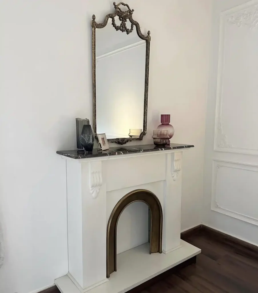 " Aubergine velvet, black marble, and brass. Curated warmth with a bold palette."