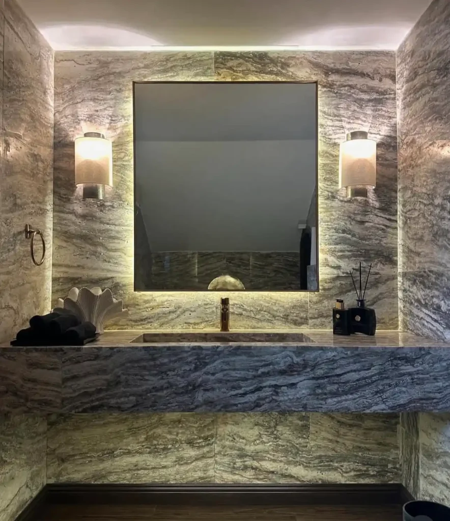 " Veined stone, linen-lit sconces, and hammered brass; An intimate study in quiet luxury."